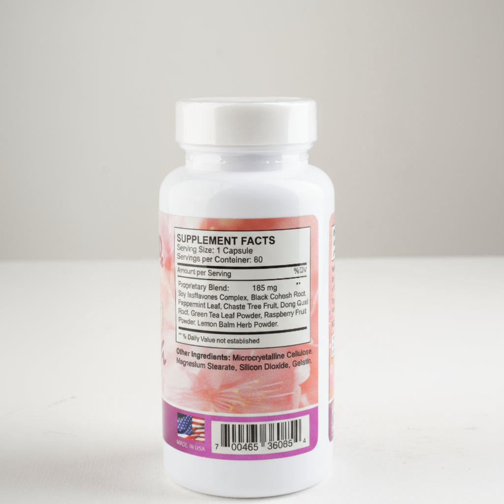 Complejo de Isoflavonas de Soya, Raíz de Black Cohosh, Hoja de Menta, Fruto de Vitex (Chaste Tree), Raíz Dong Quai, Té Verde, Polvo de Frambuesa y Melisa.